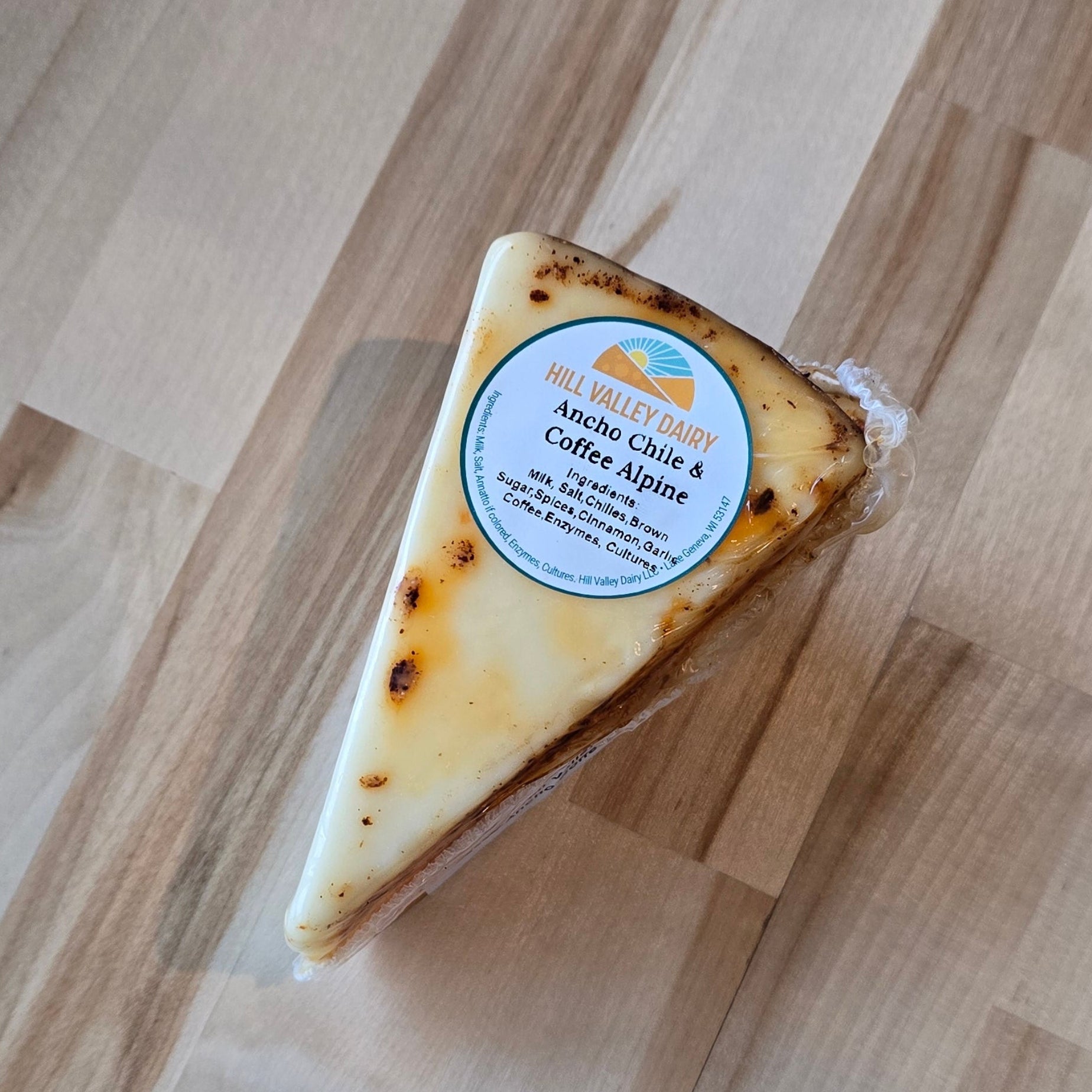 One of our most popular flavored Alpine, the creamy and mild taste of the Alpine cheese is kicked into high gear with the savory addition of the Coffee Ancho Chili rub we place on the rind. 6oz